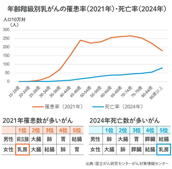 乳がんは、乳房の中にある乳腺(母乳をつくるところ)にできる悪性腫瘍で、乳がんの発生や増殖には、「エストロゲン」と呼ばれる女性ホルモンが深くかかわっています。1年間に約92,000人が乳がんになり、年齢別にみると、30歳代から急上昇し、40歳後半から60歳代にもっとも多くみられます。また、乳がんで亡くなる女性は、1年間に約15,000人で、交通事故で亡くなられる方の5倍にもなります。