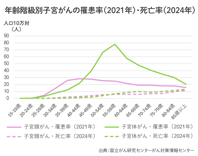 これに対して、「子宮体がん」は、年間17,000人が発症し、約2,600人が亡くなっており、一般的には50歳以上の閉経後の女性に多い病気です。